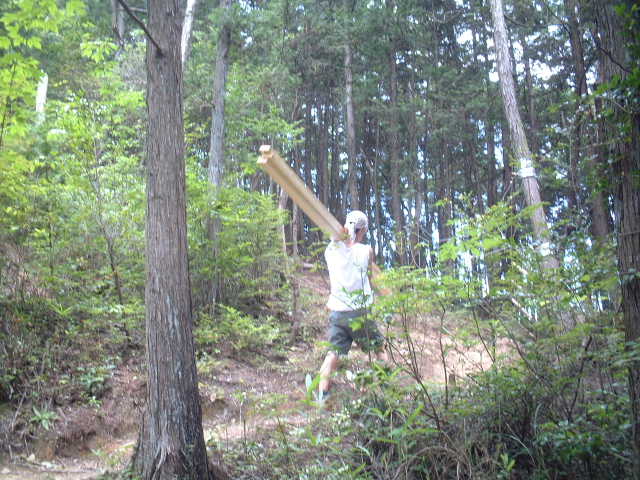 丸太や竹を担ぎ上げる。